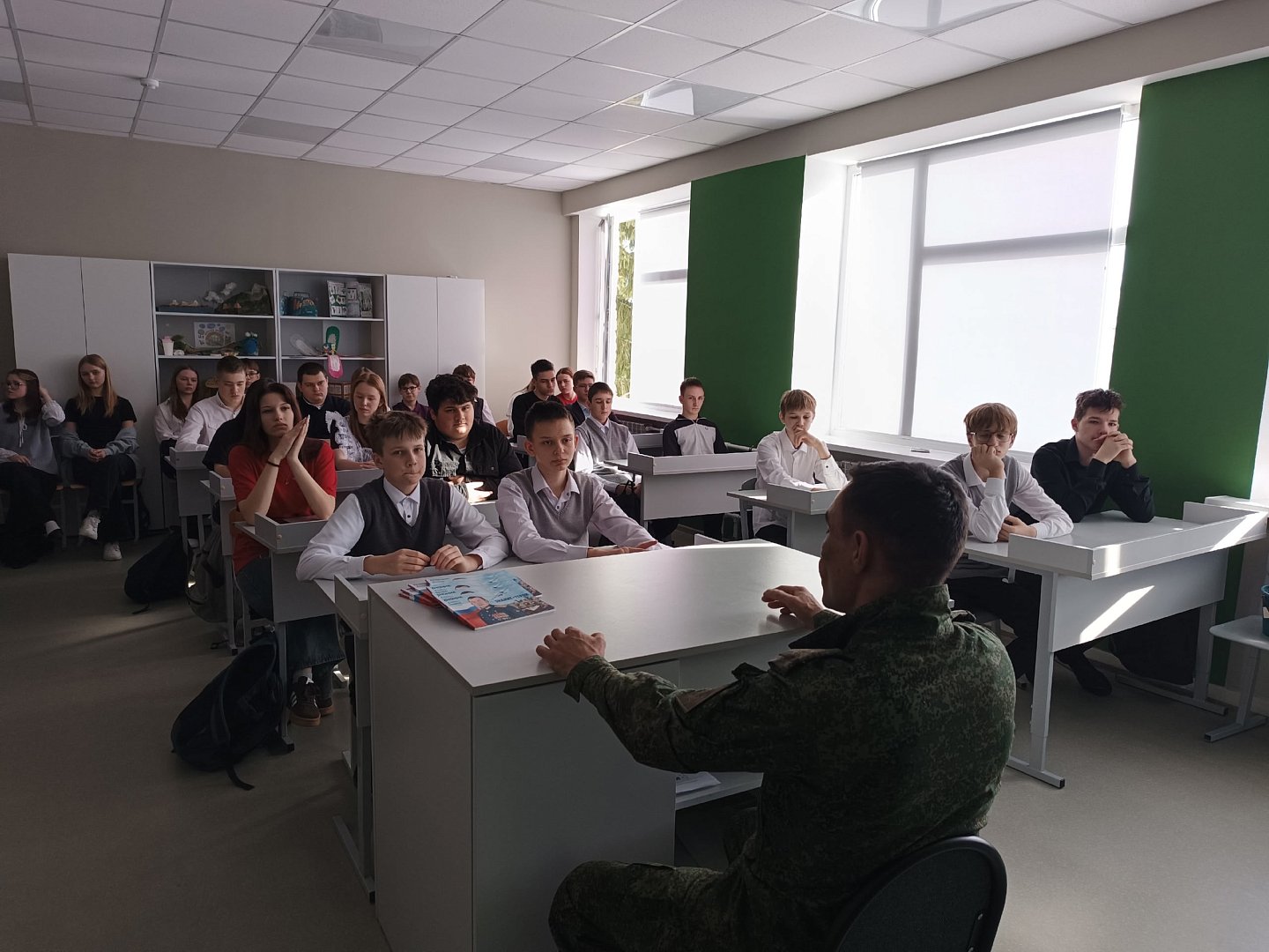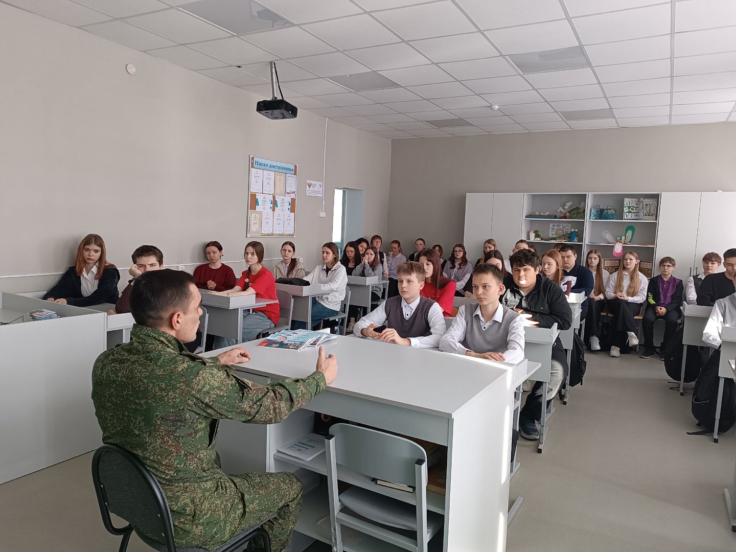 Особую атмосферу мероприятию придали приглашенные специалисты Центра занятости населения. Они провели для старшеклассников профориентационную беседу, рассказав о военных специальностях, которые можно получить в высших учебных заведениях города Саратова. Ребята узнали, какими личностными и физическими качествами должен обладать будущий защитник Отечества и какие перспективы открываются перед выпускниками военных вузов.