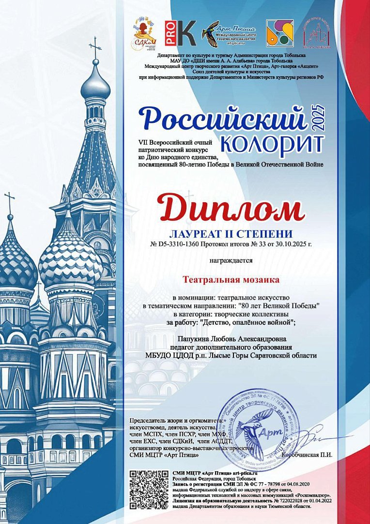 За своё мастерство участники коллектива (руководитель Л.А. Папукина) были удостоены диплома лауреата второй степени, став ярким примером высокого уровня творчества и профессионализма юных артистов.
