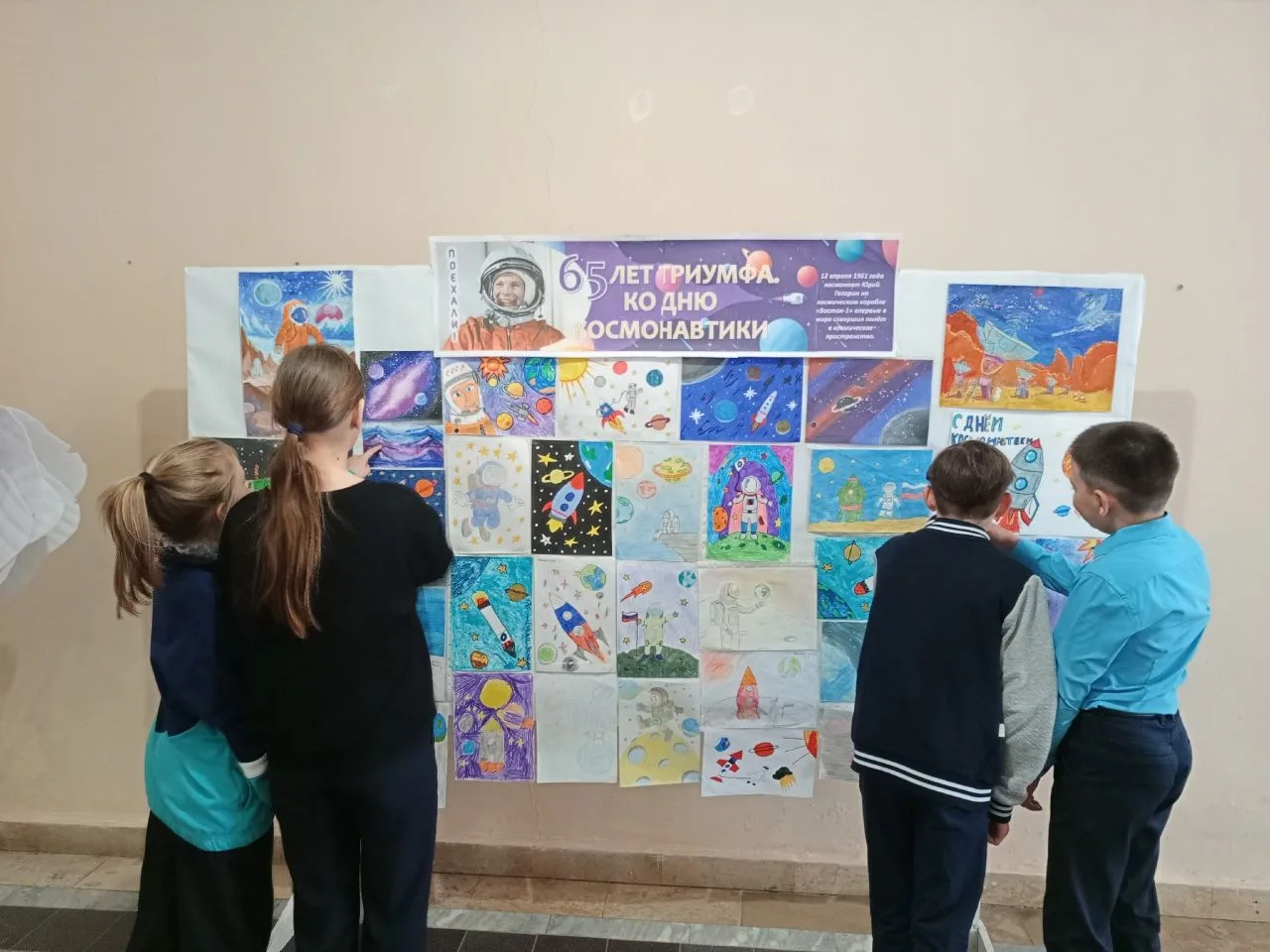 В школе № 2 р.п. Лысые Горы оформлена выставка рисунков. Ровно 65 лет назад человек впервые вырвался в космос — и юные таланты решили напомнить об этом через творчество.