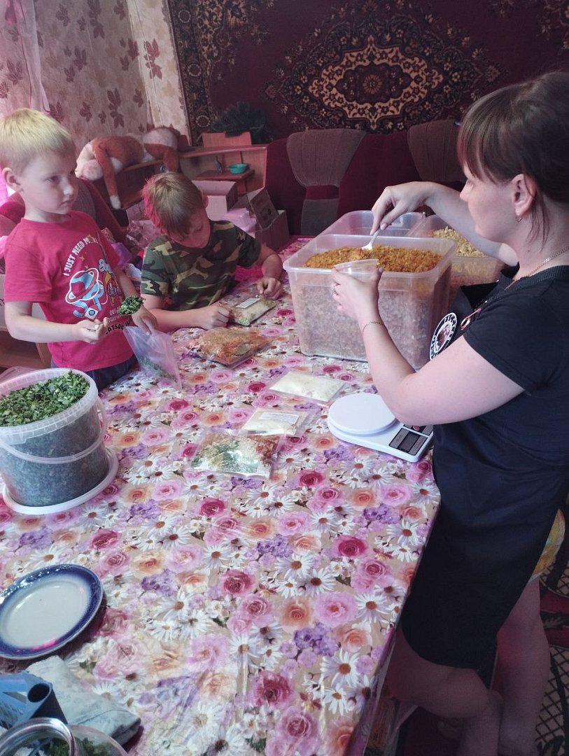 Младший Артём, пока ещё маленький, но уже не менее важный помощник. Он спокойный, рассудительный и все держит на контроле. Даже на фасовке сухих супов для фронта, которыми занимается мама, он старается ничего не упустить из виду, деловито «руководя» процессом.