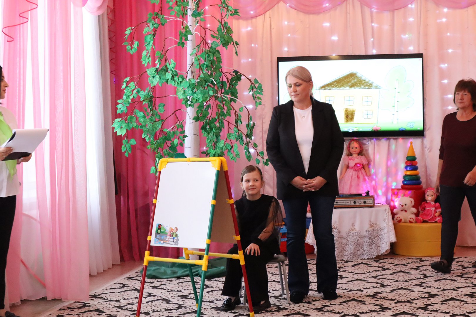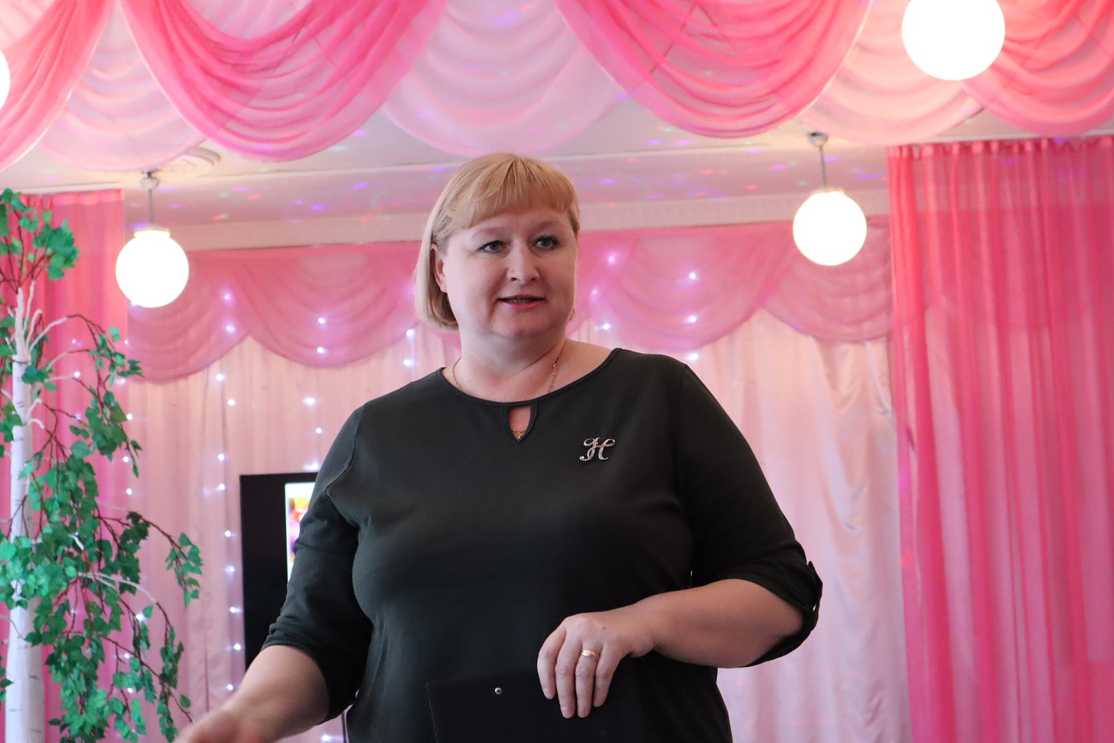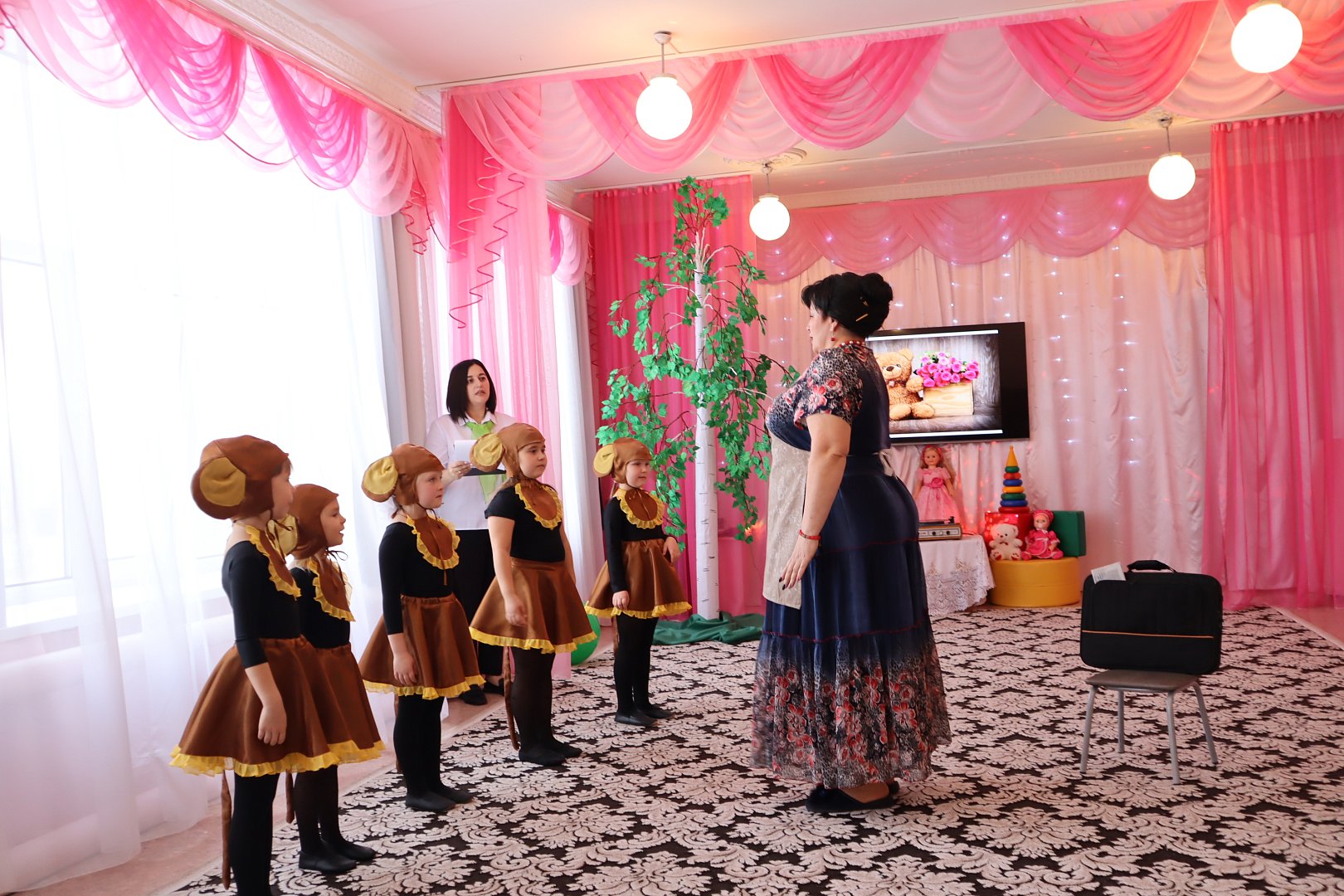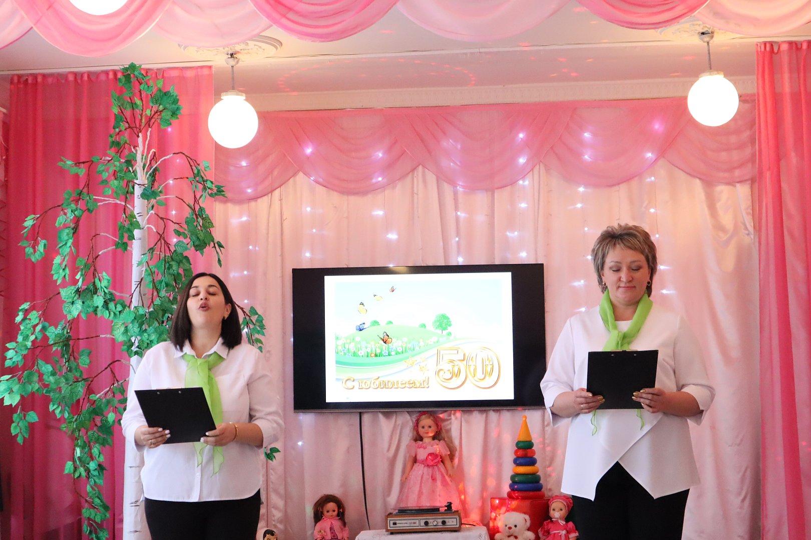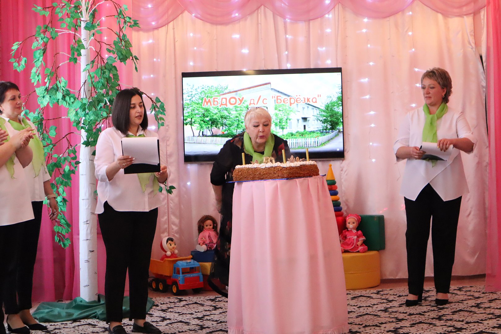 Вот и детский сад, отметивший на прошлой неделе свой полувековой юбилей носит название этого замечательного дерева – «Березка». Именно в стиле березовой рощи оформили актовый зал, куда пригласили гостей праздника. Кроме этого, все педагоги юбилейного мероприятия, сами были, как березки – все как один в черных брюках, белых блузках и с шарфиком, цветом березовой листвы, сразу погружая присутствующих в тему встречи.