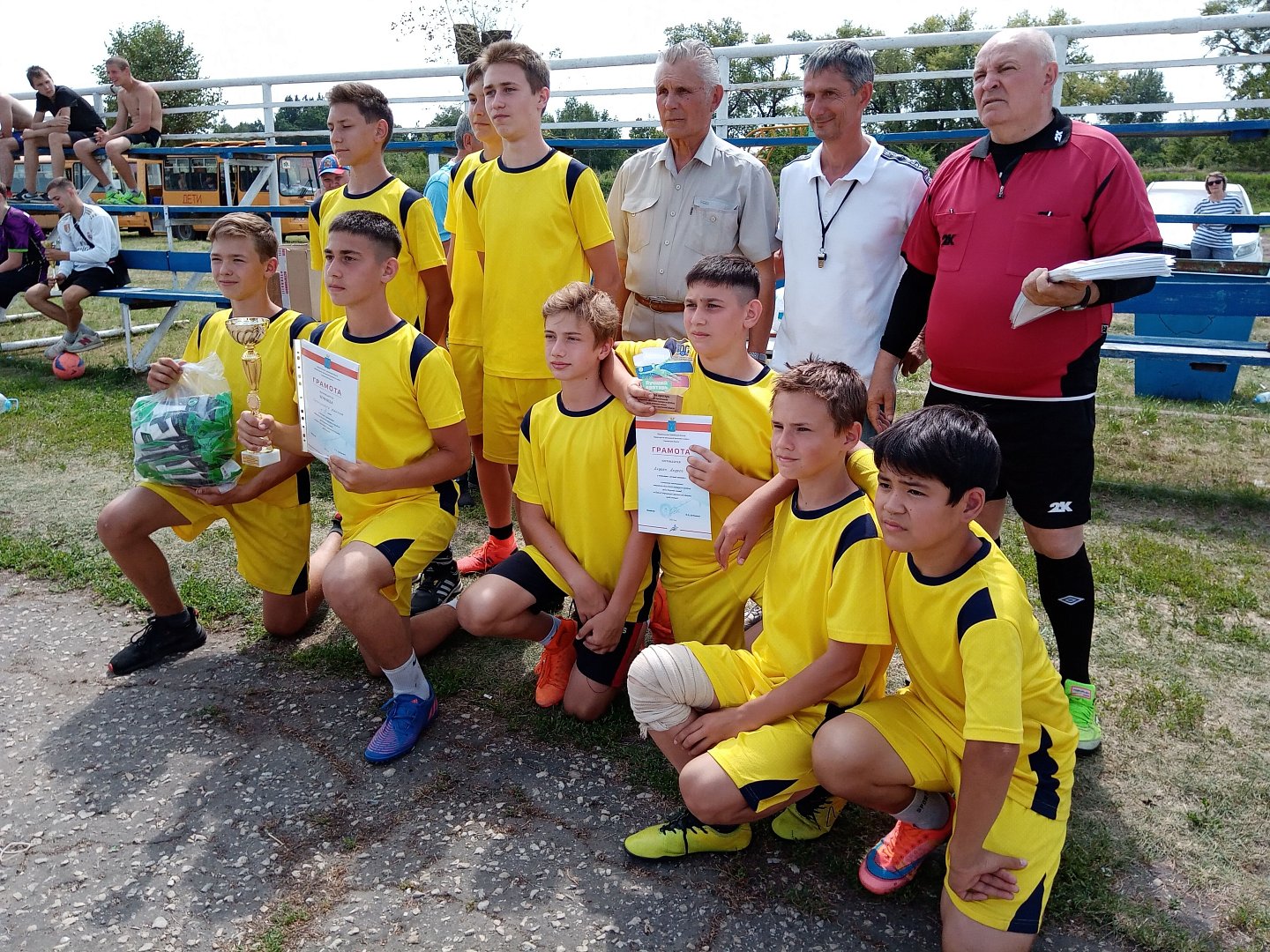 И вот уже дружными аплодисментами юные спортсмены встречают сигнал на итоговое построение. Судьи подвели итоги и готовы назвать призёров соревнований по дворовому футболу.