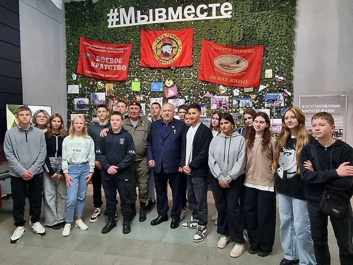 В прошлую субботу ученики 9А класса со своим классным руководителем Н.В. Артамоновой отправились в Музей истории специальной военной операции. Туда же прибыл Герой России, депутат Государственной Думы, генерал-полковник Владимир Шаманов. Его сопровождал Герой России, депутат Саратовской областной думы Александр Янклович.Во время своего визита Владимир Анатольевич пообщался со школьниками и передал несколько экспонатов в коллекцию музея: складную пехотную лопату немецкого производства и шведский армейский котелок, которые были доставлены из Курской области нашими военнослужащими и волонтерами.