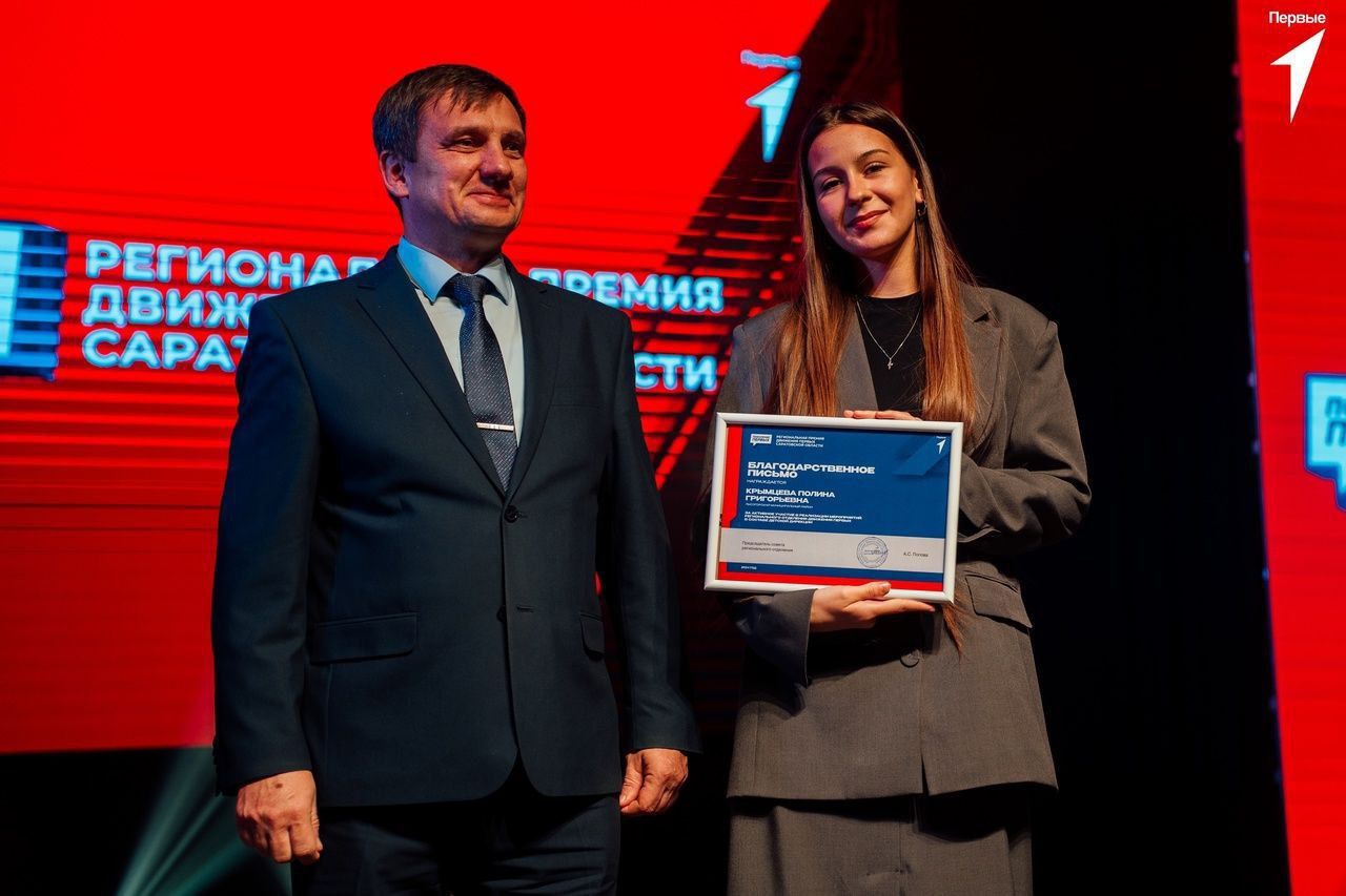 Ярослава Милаева, активистка первичного отделения "Движения Первых" МБОУ СОШ №1 р.п. Лысые Горы, стала участницей торжественной церемонии награждения и была награждена дипломом победителя в номинации "Труд, профессия и свое дело".