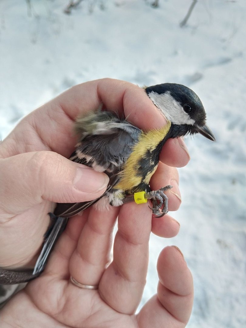 В этот раз в ловушку для птиц попались поползень и большая синица. Ребята определили у них вид, пол, замерили размеры крыла и хвоста, сделали кольцевание и отпустили на волю.