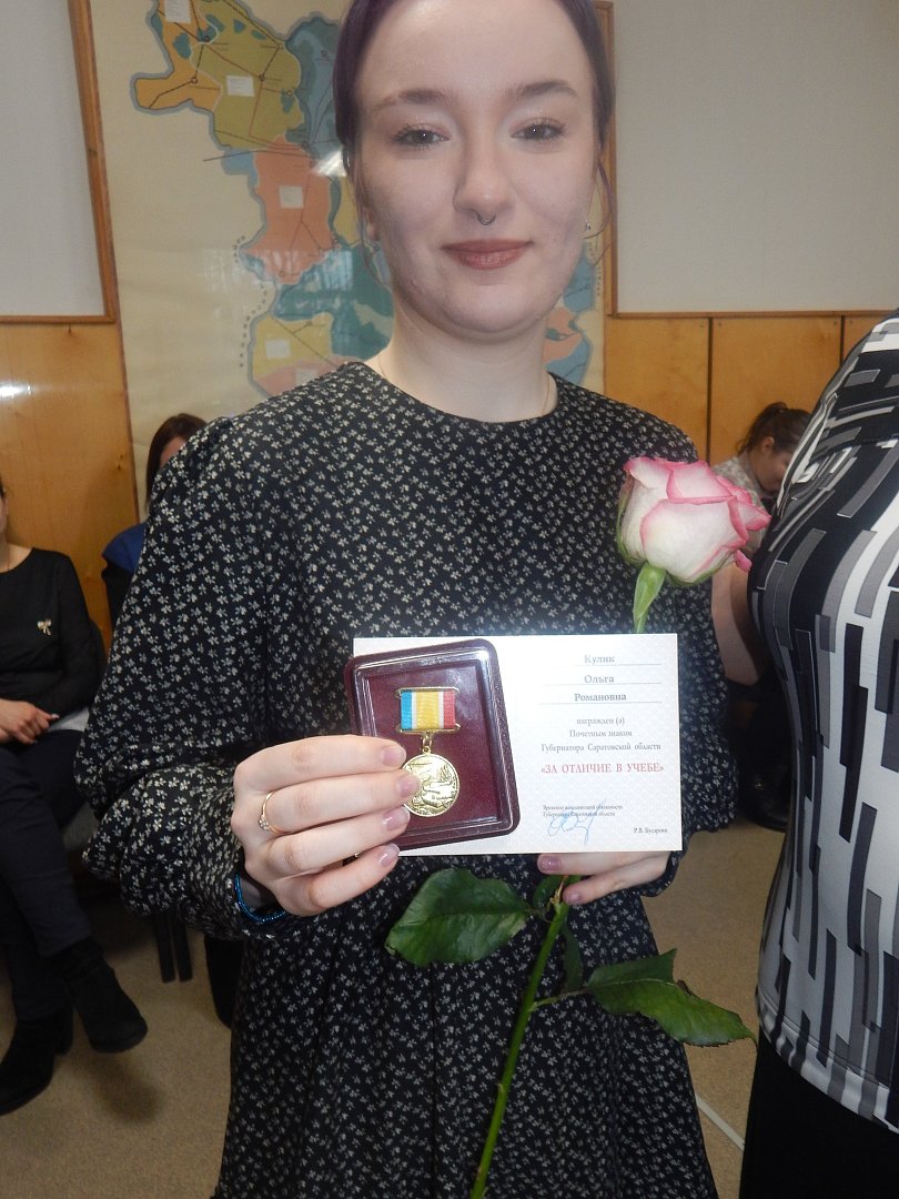 Успешно сдав ЕГЭ, она поступила в университет технологий управления и экономики города Санкт-Петербург. После завершения учебы Оля получить специальность – лингвист-переводчик. Учиться очень нравится, с заданиями справляется, а как результат досрочная сдача всех экзаменов и зачетов. И, вот наконец-то она дома в Лысых Горах. А здесь ее уже давно дожидается почетный знак губернатора Саратовской области «За отличие в учебе». Его в предпраздничные дни Ольге Романовне Кулик вручила глава района В.А.Фимушкина. Валентина Александровна поблагодарила родителей, учителей и саму отличницу за ответственное отношение к учебе, труду, родительским обязанностям и пожелала ставить новые цели и идти к ним.