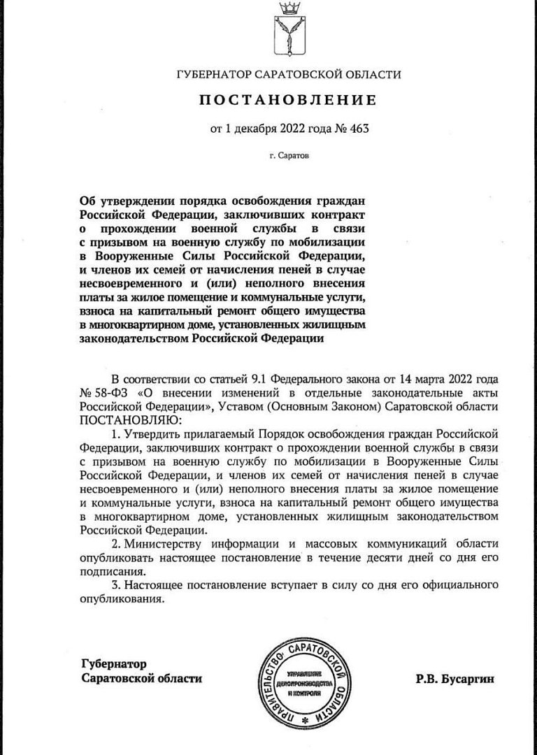 Мобилизованных Саратовской области и членов их семей освободили от пеней за ЖКУ
