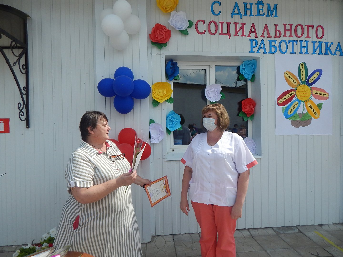 В праздничный день, в ГАУ СО «Лысогорский дом-интернат для граждан, имеющих психические расстройства», состоялось торжественное мероприятие. Заместитель директора по лечебной части - Т.И.Загоруйко от имени администрации учреждения, всем социальным работникам выразила искреннюю благодарность за внимание и заботу к проживающим, за чуткость и участие к судьбам людей, нуждающихся в поддержке государства. Пожелала крепкого здоровья, мудрости и терпения, счастья и благополучия сотрудникам и их семьям.
