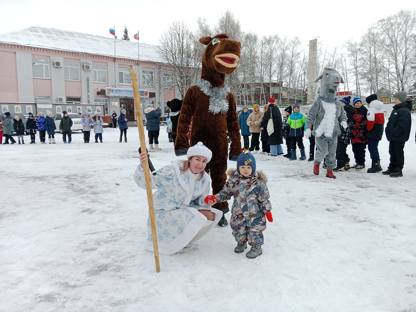 Юных лысогорцев развлекали Дед Мороз и Снегурочка со своими помощниками. Сказочных волшебников дети встретили с радостью, ведь их они ждали целый год, поэтому успели соскучиться. Дедушка с внучкой сразу вовлекли ребят в хоровод. Конечно, дружно пели песни, танцевали и играли. Даже Деда Мороза чуть без варежки не оставили.