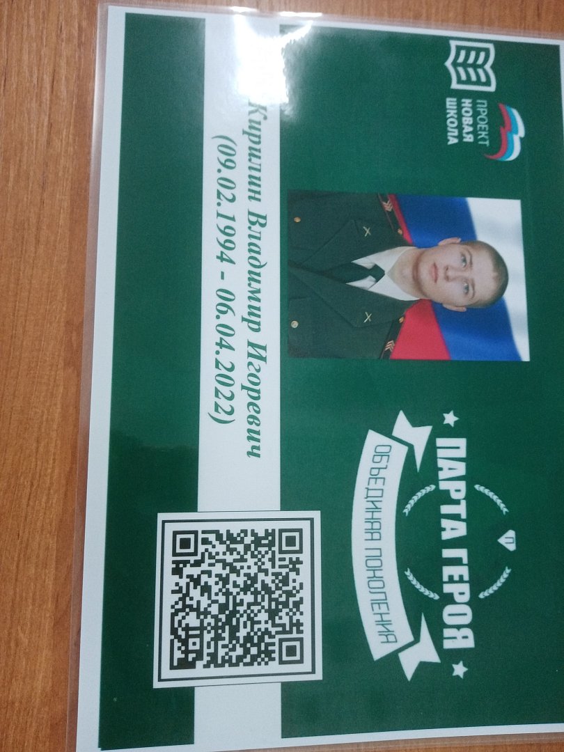 Парта открыта в честь выпускника этой школы Кирилина Владимира Игоревича, погибшего в ходе СВО и награжденного Орденом Мужества посмертно.
