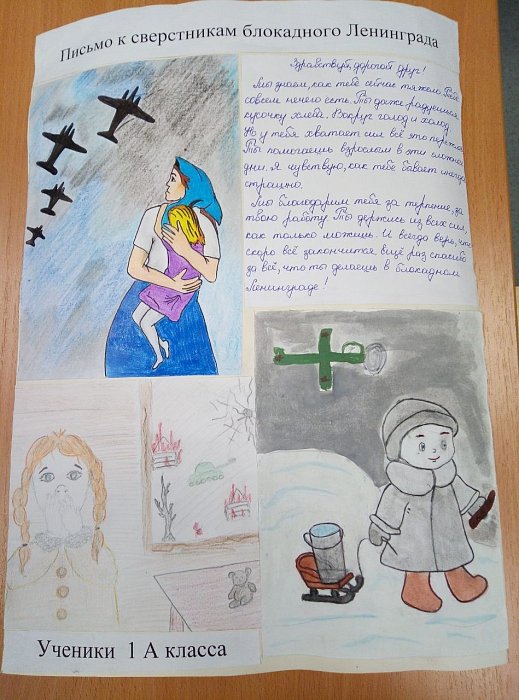 Ученик 2 «А» класса Бадиков Андрей в своем письме обратился ко всем жителям блокадного Ленинграда: «Спасибо за то, что мы спим спокойно, не знаем голода, холода, не слышим взрывов. Я обещаю, что сделаю все, чтобы не было войны. Я обязательно буду защищать свою Родину».