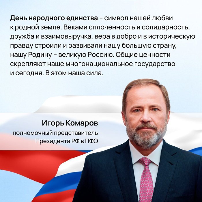 "Уважаемые жители Приволжского федерального округа!Поздравляю вас с Днём народного единства! Этот праздник – символ нашей любви к родной земле. Веками сплоченность и солидарность, дружба и взаимовыручка, вера в добро и в историческую правду строили и развивали нашу большую страну, нашу Родину – великую Россию.