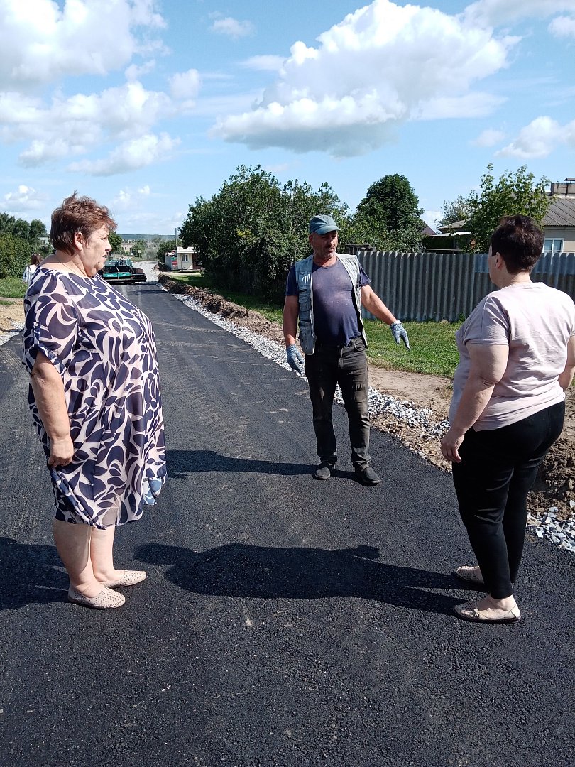 Валентина Александровна побеседовала с рабочими и старостой поселка А.А.Тишиным, который контролирует ход дорожных работ.