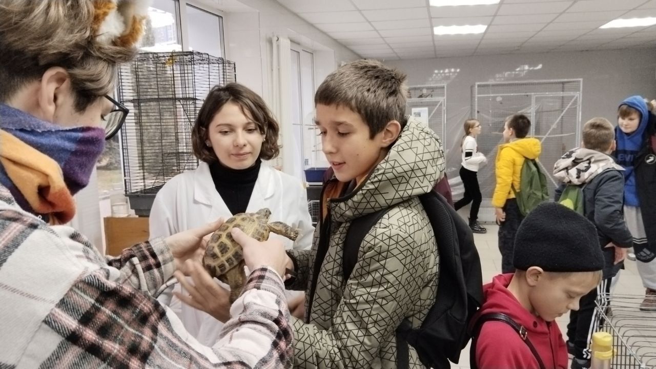 Юннаты узнали об интересных растениях, некоторые из которых являются даже хищными, подержали морских свинок в руках, покормили с рук хамелеона и поглядели на черепаху, сову и коршуна.