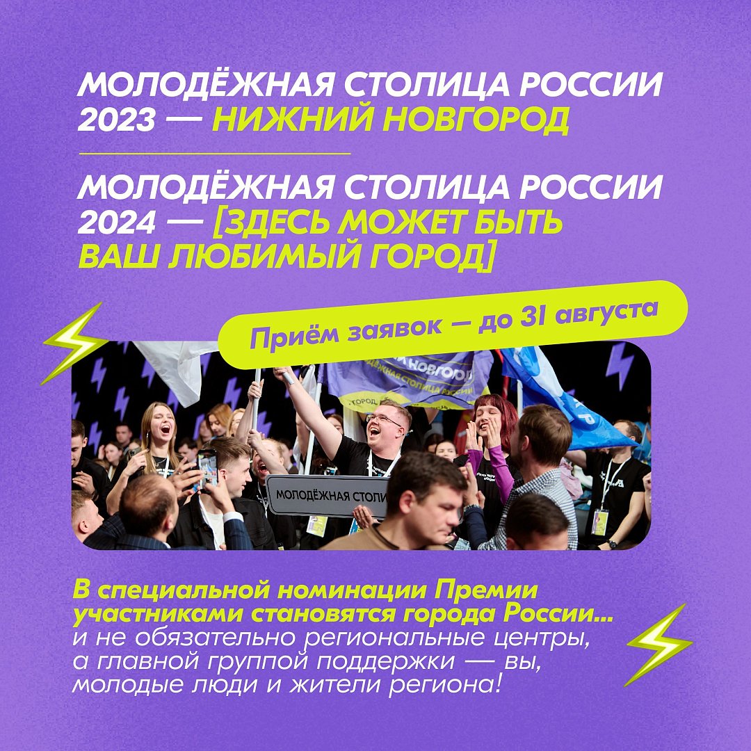 - Молодёжная столица России (приём заявок – до 31 августа);