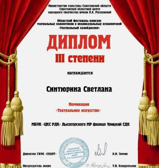 Директор Урицкого СДК приняла участие в областном смотре-конкурсе театральных коллективов и индивидуальных исполнителей «Театральный калейдоскоп». В номинации «Театральное искусство» Светлана Синтюрина награждена диплом третьей степени. Она читала стихи «Один мой друг подбирает бездомных кошек» ( Д. Сидерос) и «Боже, храни отчаливших на рассвете» (А. Сеничева).