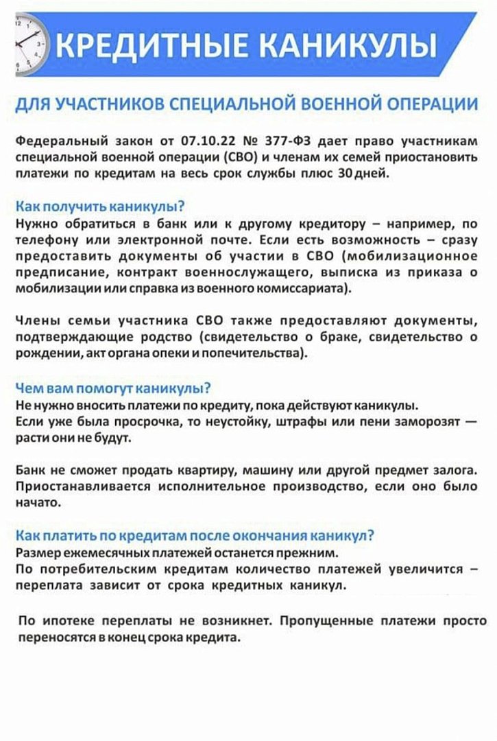 Участники специальной военной операции (СВО) и члены их семей могут приостановить платежи по кредитам на весь срок службы и плюс 30 дней.