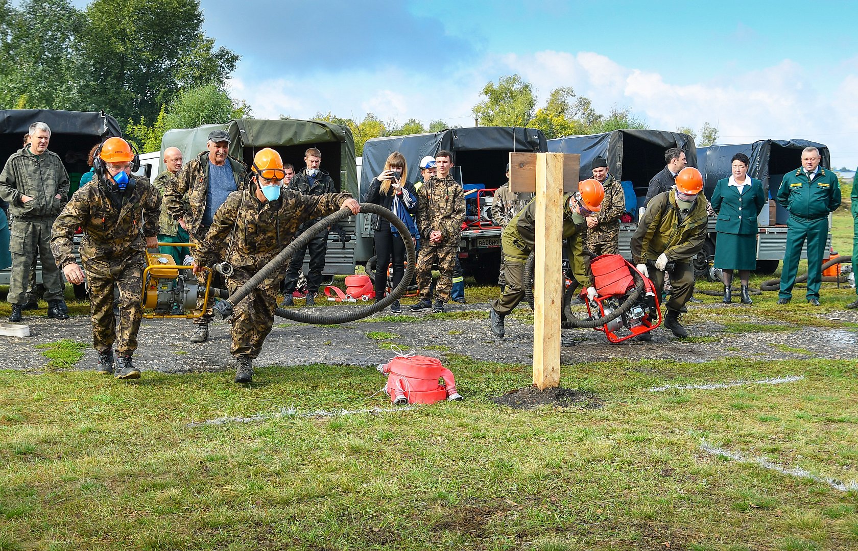С самого утра на стадионе шли соревнования в рамках областного конкурса «Лучшее лесопожарное формирование». В теоретической части конкурса приняли участие 17 лесохозяйственных учреждений области, по результатам тестирования 6 команд были отобраны для участия в практическом этапе. Во втором туре участникам предстояло справиться с полосой препятствий, тушением условного пожара с применением мотопомпы, раскряжевкой бревна бензомоторной пилой и продемонстрировать применение беспилотного летательного аппарата.