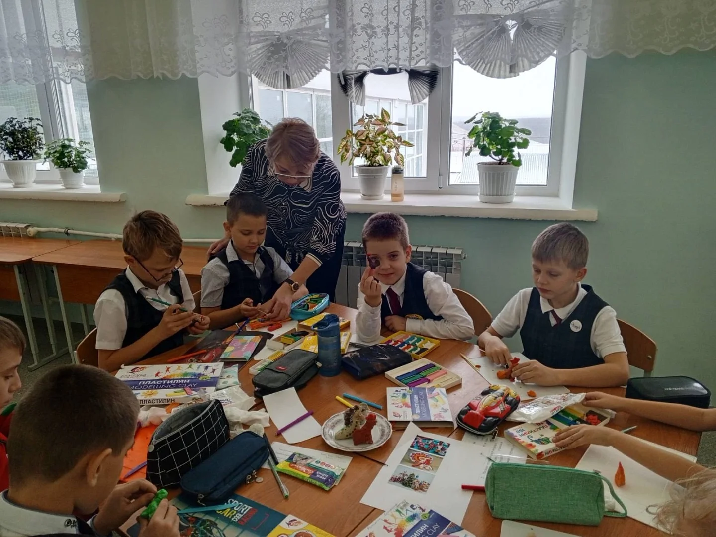 На внеурочное занятие к третьеклассникам пришел яркий и веселый Петрушка (Матвей Самсонов), который помог Ольге Юрьевне Ануфриевой познакомить ребят с принципами изготовления саратовской глиняной игрушки.