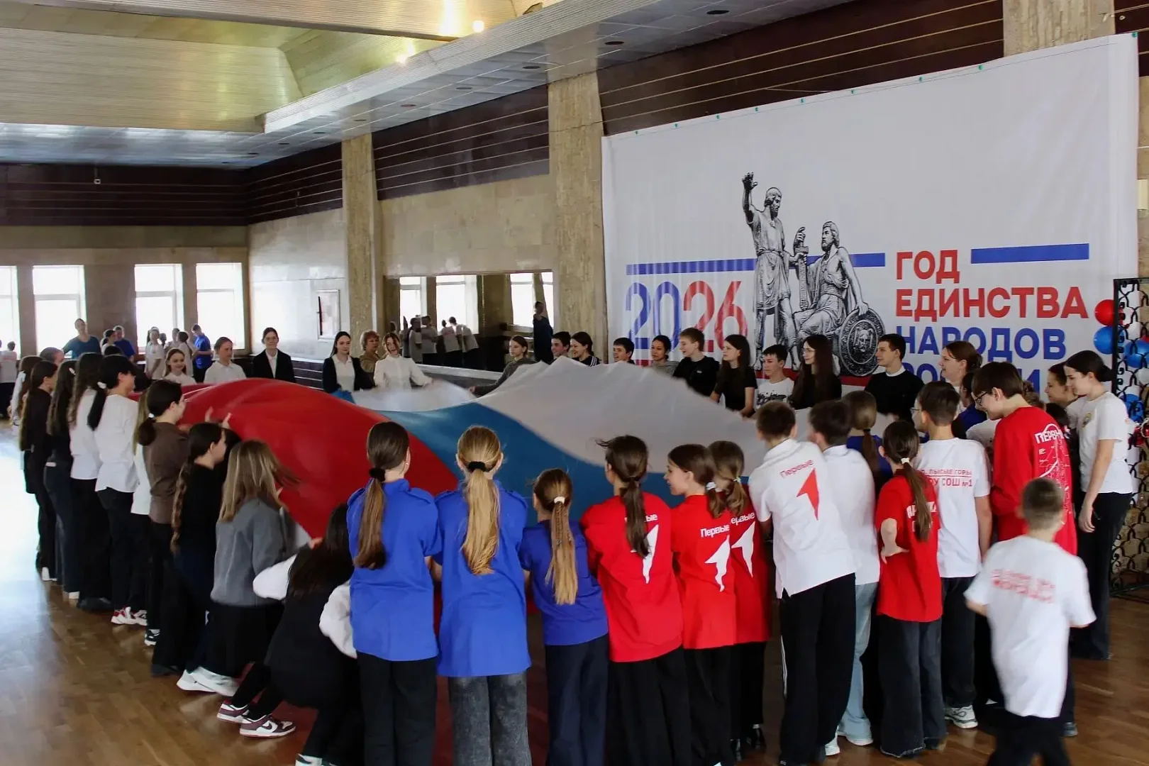 В завершении мероприятия школьники исполнили яркий танцевальный флешмоб и развернули масштабное полотно российского триколора.