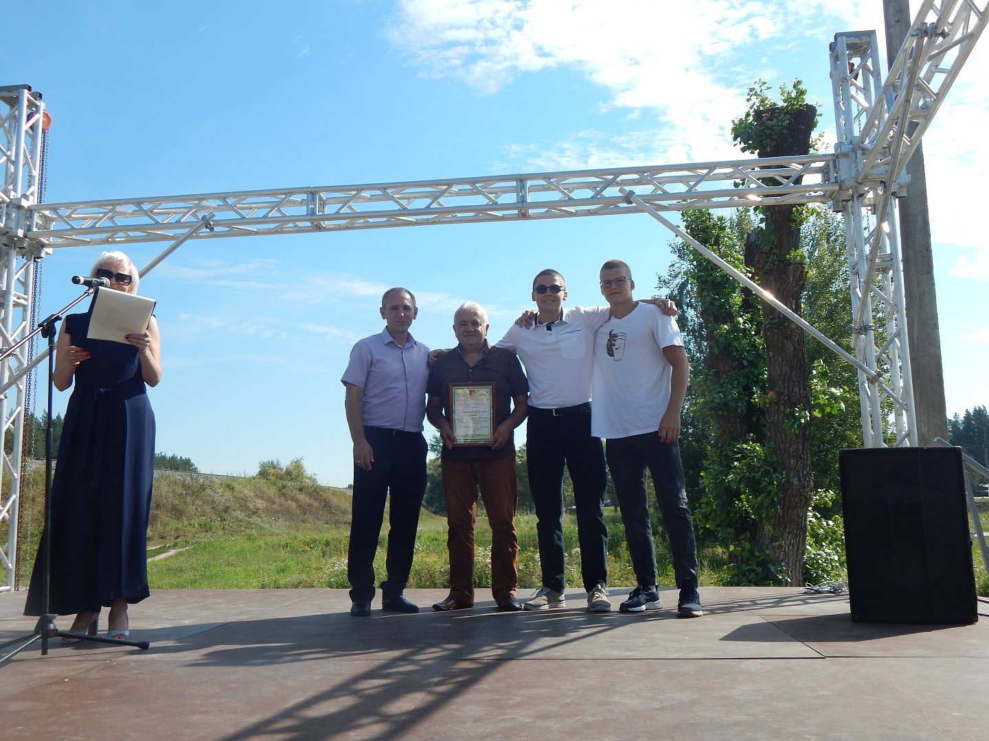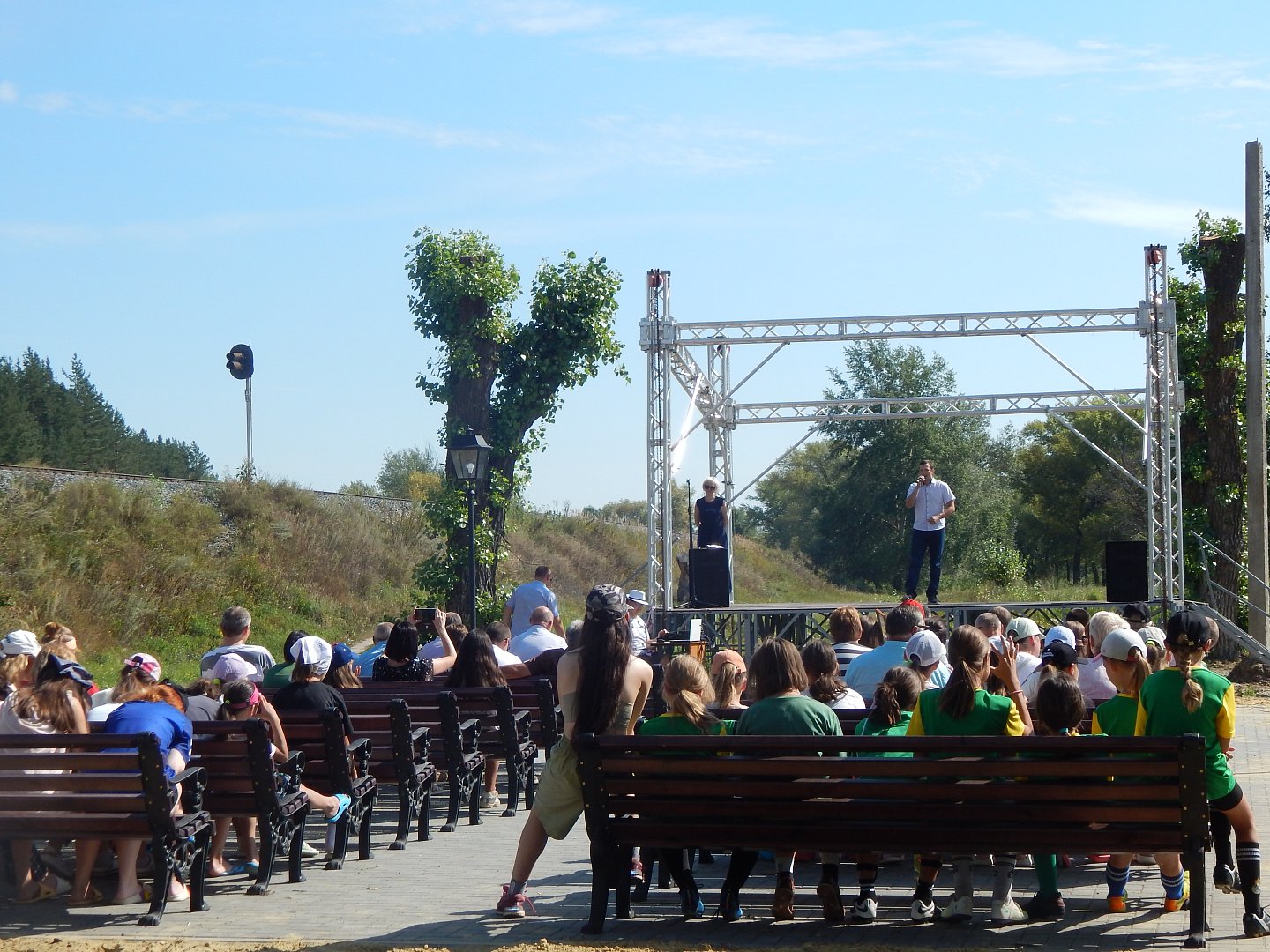 Торжественная часть началась в 10.00 в парке. Кстати, здесь оборудована площадка для концертов: поставлен сценический комплекс, установлены скамейки. Благоустройство территории продолжается благодаря участию района в программе «Формирование комфортной городской среды», инициированной Президентом России В.В. Путиным.