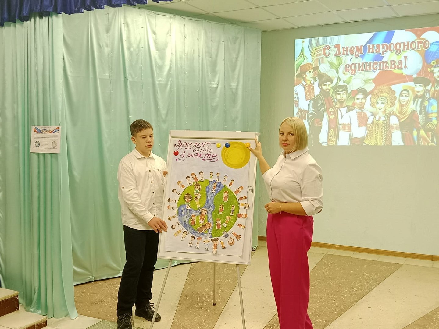 Надо добавить, что за активное участие и правильные ответы дети получали фигурки в национальных костюмах. На стации «Патриот» они совместно изготовили плакат «Время быть вместе», который разместили чуть позже в общественном месте на улице.