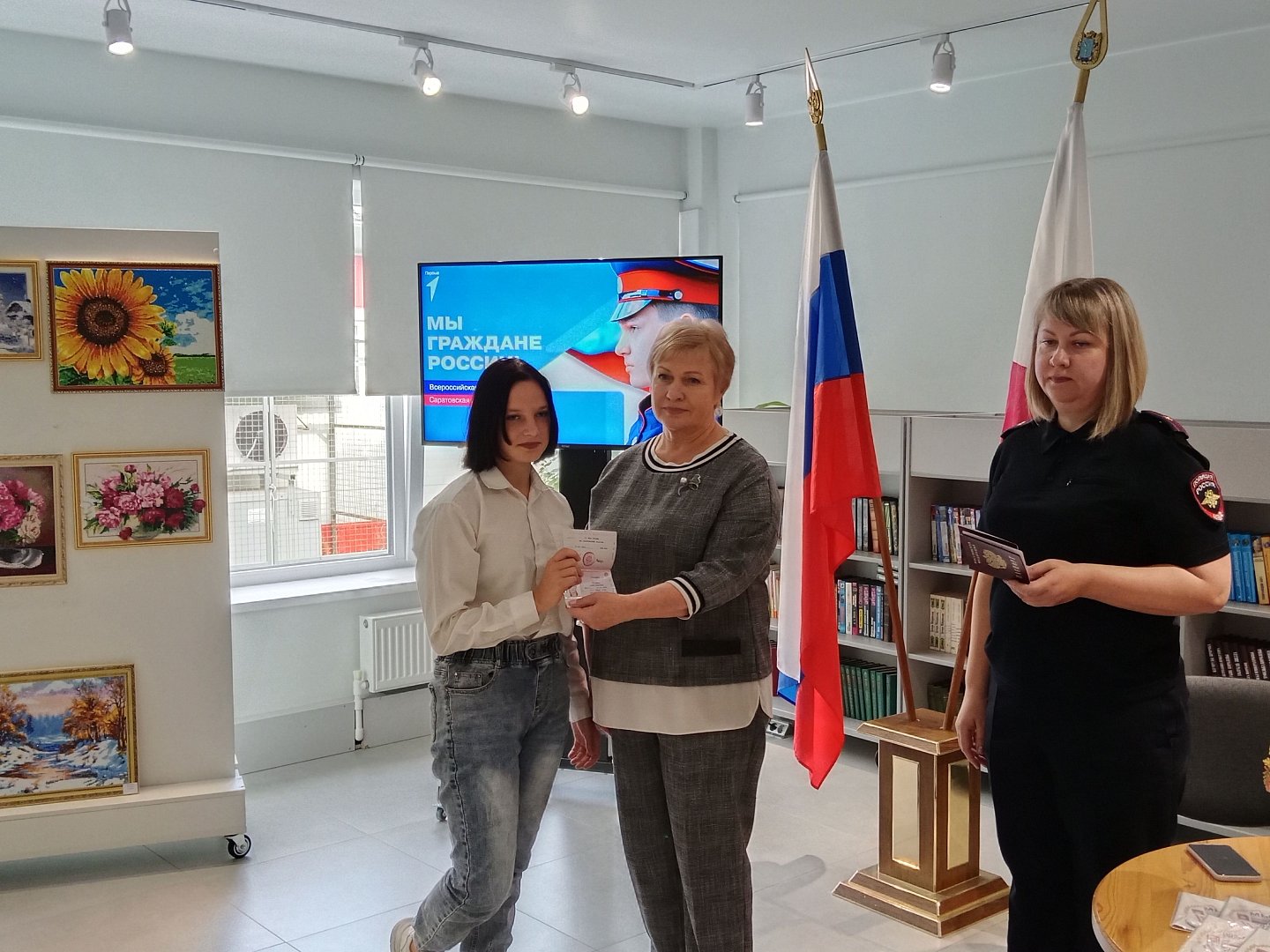 На базе районной библиотеки Лысогорский филиал ГБУ РЦ «Молодежь плюс» совместно с муниципальным отделением «Движение Первых» провели торжественное вручение паспортов юным жителям в рамках Всероссийской программы «Мы – граждане России!».