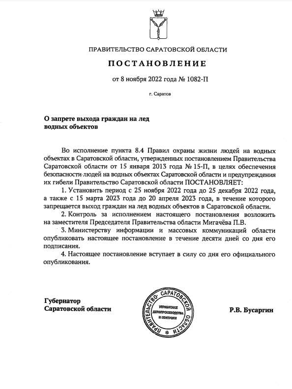 С 25 ноября жителям региона будет запрещено выходить на лед. Соответствующее постановление (https://t.me/pool_64/3715) подписал Губернатор области Роман Бусаргин.